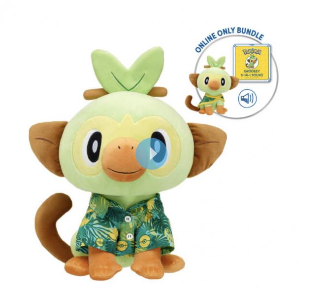 The site description for this bundle is “Down the Groove with Grookey”. “This friendly Pokémon is always by your side. The curious Grookey is a grass-type Pokémon with green fur, big eyes and ears, and a curly brown tail. The Pokémon Trainer is Grookey’s leaf print shirt, matching cloak, You’ll love this exclusive Grookey plush toy bundle with a 5-in-1 sound chip.”